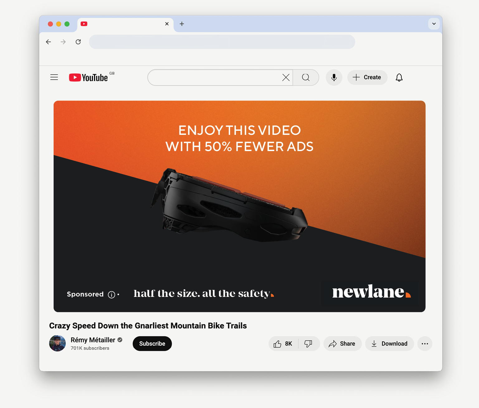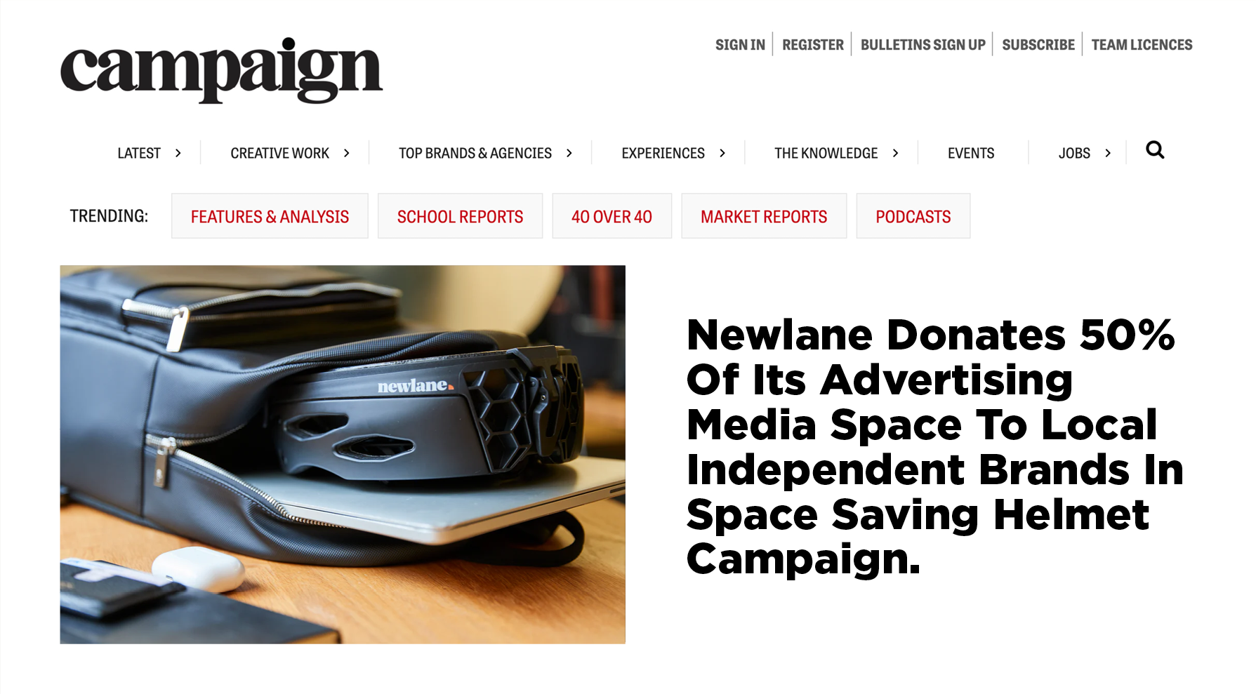 A campaign that brings Newlane’s foldable helmet to life by celebrating its space-saving benefit. Centered on the idea of “Half The Size,” it uses only half the ad space - donating the rest to like-minded, independent brands. Ambient media shrinks familiar objects to highlight the product’s compactness, while TV idents and YouTube spots give 50% more time back to viewers. A confident, generous way to sell convenience.